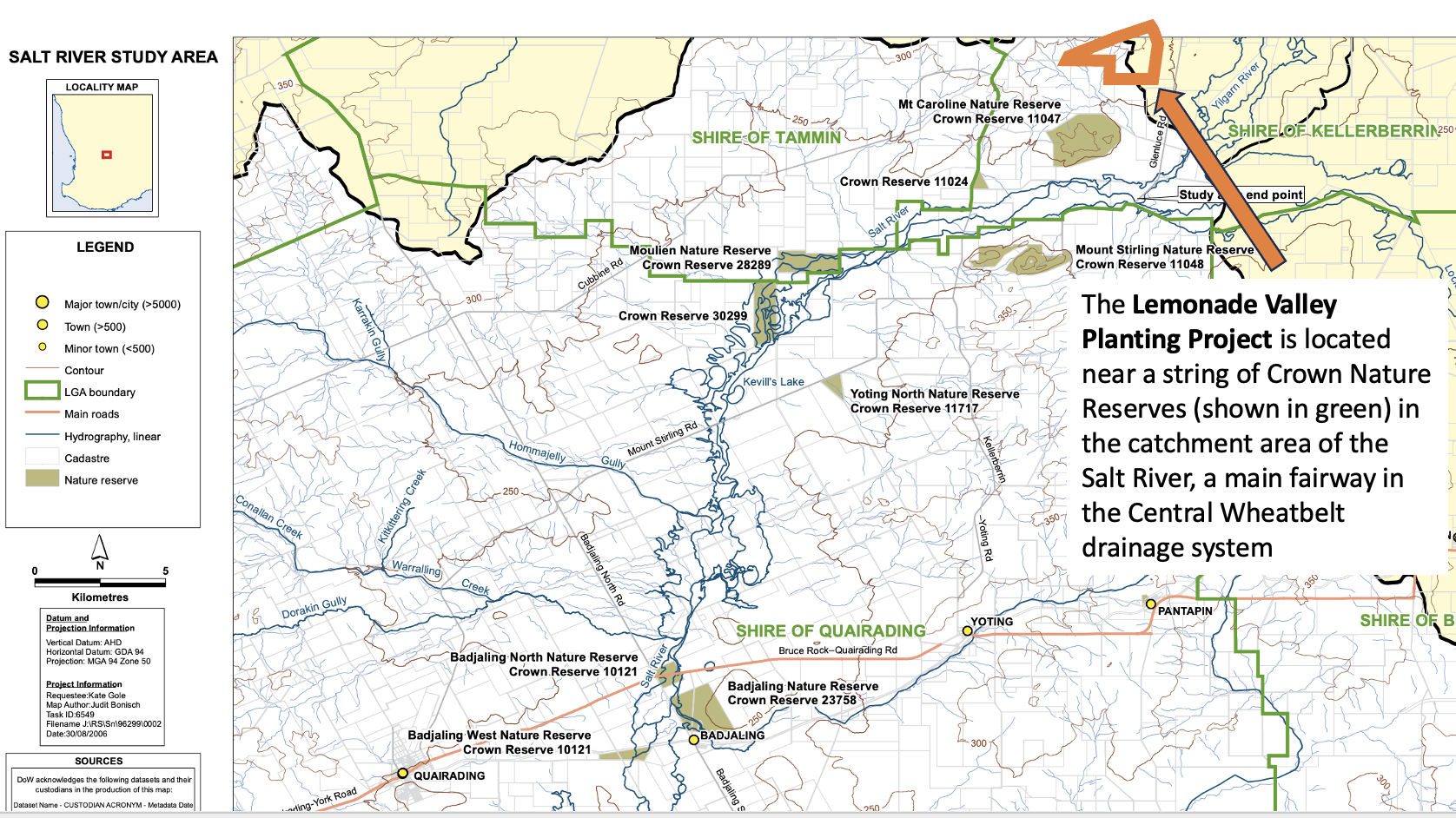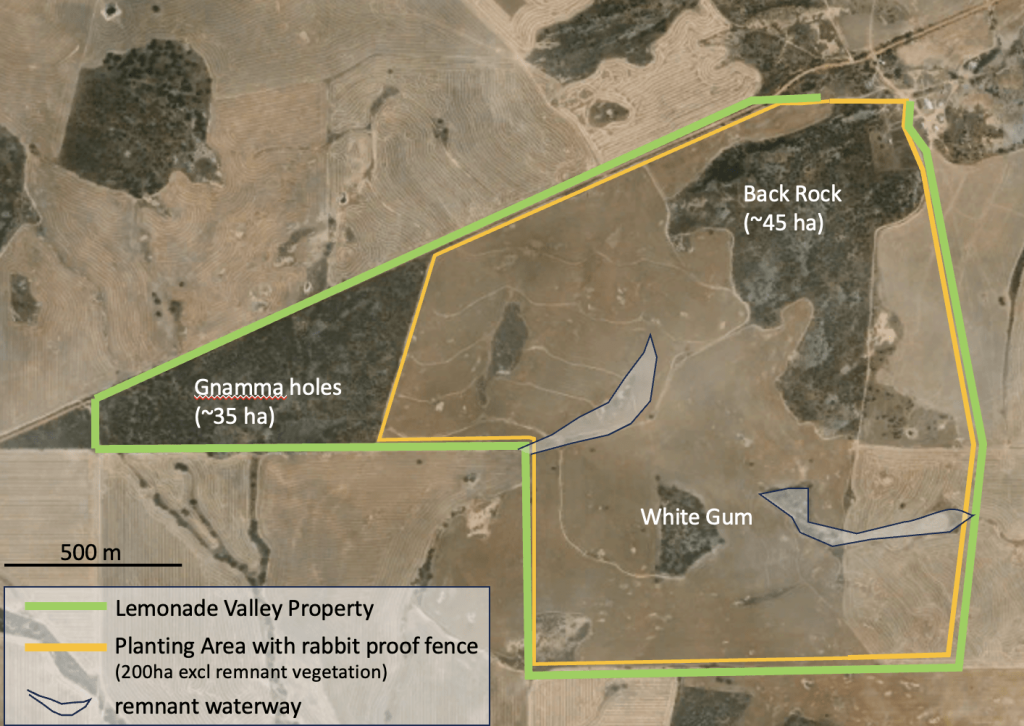 The Lemonade Valley Property includes two larger areas of native vegetation, which consist of near-original, multi-storey bushland and granite outcrop. These areas are called Gnamma Holes, app. 35 ha adjacent to the West of the Project Area and Back Rock, app 45 ha, adjacent to the northeast and enclosed by the Planting Area (see the map below).